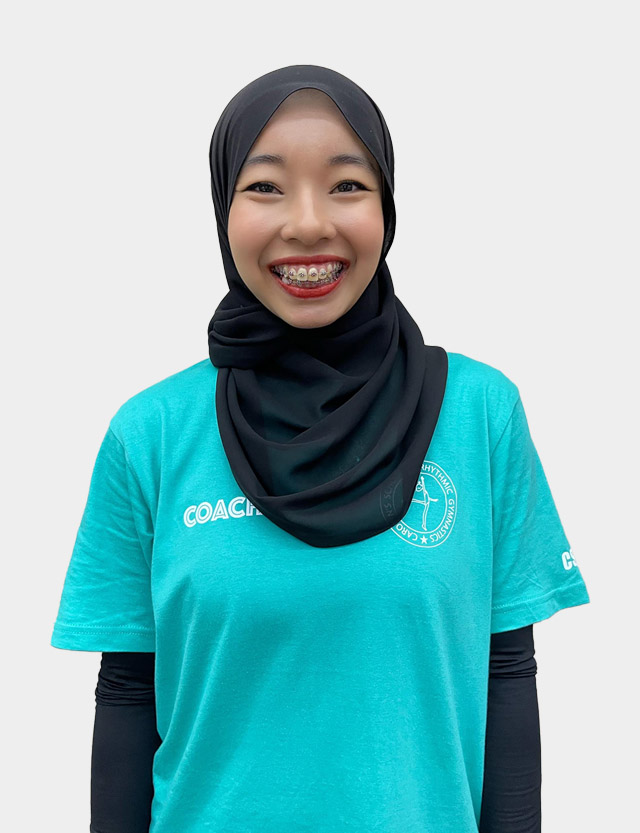 Naieme started Rhythmic Gymnastics at the age of 4 and pursued the sport for 13 years before retiring at the age of 17. At age 5, she trained under the guidance of Ms Eriko Akebayashi (Japan) who is the current National Group Exercise Coach. At the age of 11 years old, she was selected into the National Team and trained under Ms Julia Ivanova (Russia), currently National RG Coach for Malaysia. Naieme has competed in multiple National competitions such as MSSM, SUKMA, National Championships and Sports Excel. She also had the privilege to travel the world for International Competitions including countries such as Japan, Greece, Italy, Poland and Spain. One of her highest achievements is having competed in the Junior Commonwealth Games held in Namibia and placed 2nd Overall Champion. She was also involved in Group Exercise competing at the Asian Championships in 2018. She is thrilled to be coaching as she is able to pass down her knowledge to up and coming gymnasts. She loves seeing girls grow and is excited to help develop their talent to the fullest potential.